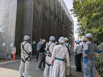 まずは安全大会の前に、現在、外壁および屋上防水改修工事を進めている