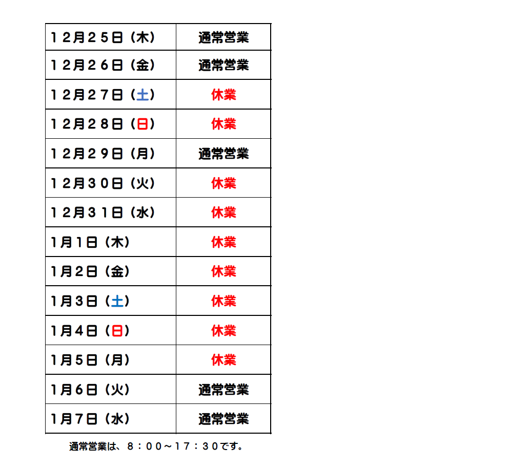 弊社では下記期間を年末年始休業とさせていただきます
